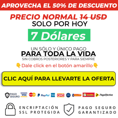 Pero NO vas a pagar 32 USD que sería un precio justo y estoy seguro que lo pagarías, HOY vas a poder acceder a tan solo 7 USD.